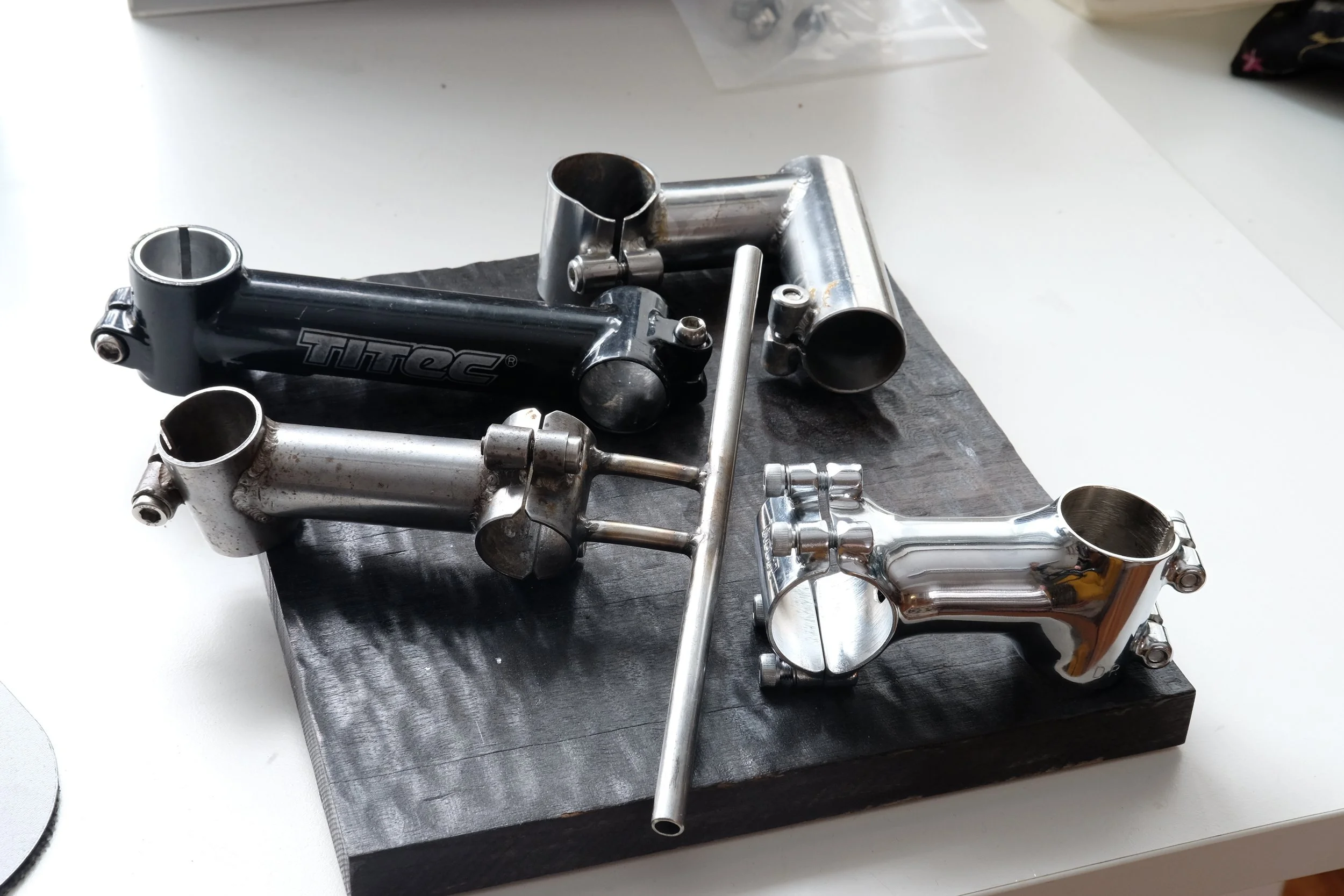 Some Tunk-made stems and references. 90s Titec, Tunk OS tall stack, Nitto fillet brazed and Tunk with weird special face plate bag holder